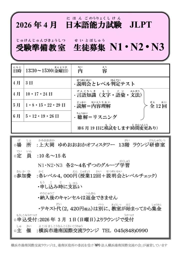 2026年4月 日本語能力試験 JLPT 受験準備教室 N1・N2・N3